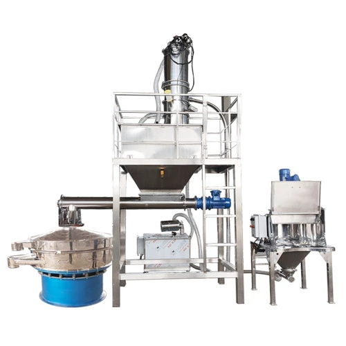 真空加料机中装有压缩空气反吹装置,每次放料时,压缩空气脉冲反吹过滤器,把吸附于过滤器表面的粉末打落下来,以保证吸料能正常运行。