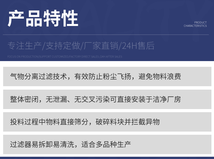 4. 密闭式上料,杜绝粉尘飞扬,无热量产生,改善工作环境,降低生产成本;