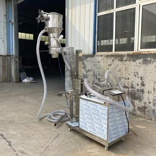 真空加料机中装有压缩空气反吹装置,每次放料时,压缩空气脉冲反吹过滤器,把吸附于过滤器表面的粉末打落下来,以保证吸料能正常运行。